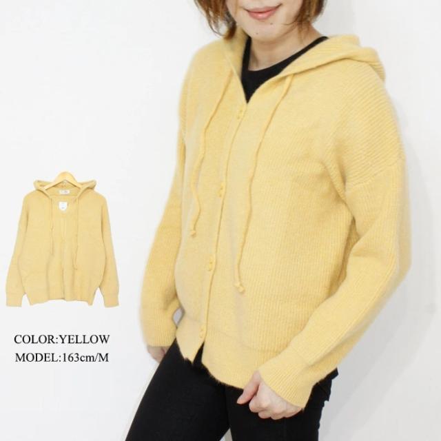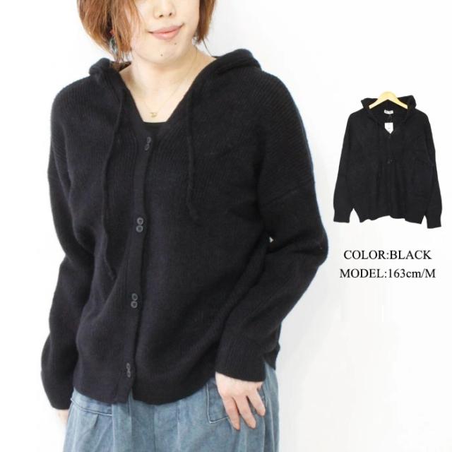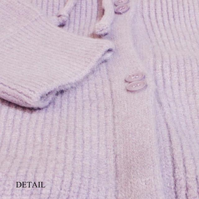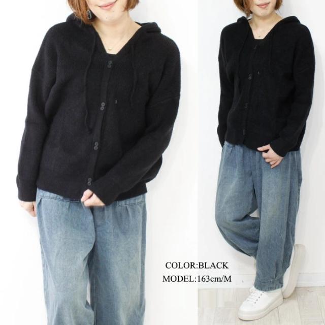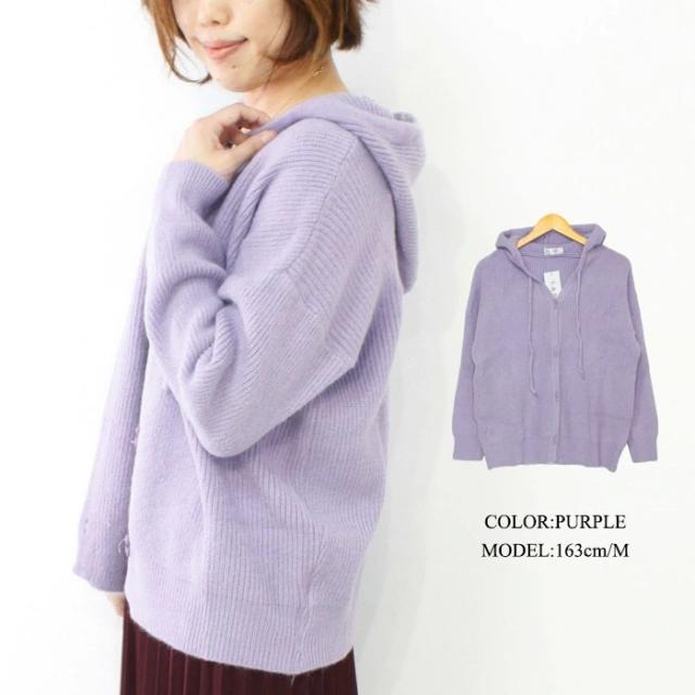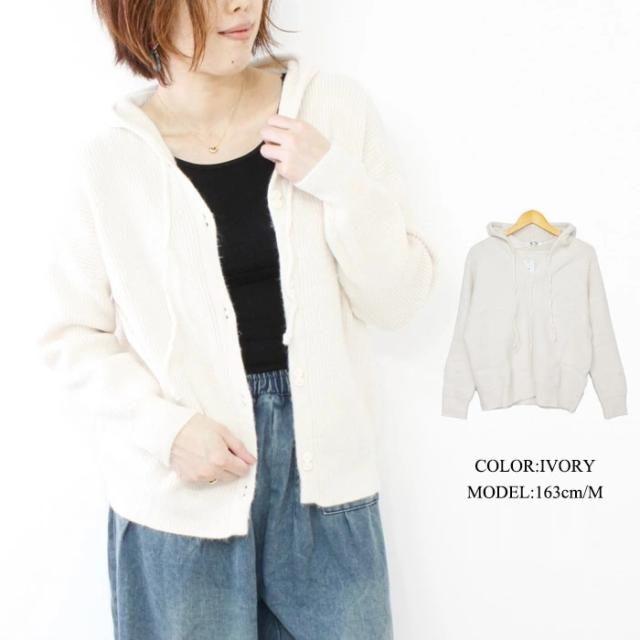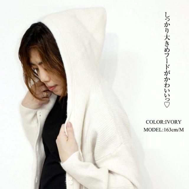おしゃれ上級者にみえちゃうフードのカーディガン。二個連なったボタンデザインがかわいい!ざっくりゆったり羽織れそう。ドロップショルダーデザインだから肩周りもゆったり