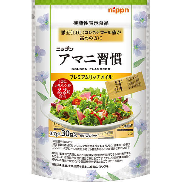 届出表示:本品にはアルファ-リノレン酸が含まれます。アルファ-リノレン酸は血中の悪玉(LDL)コレステロール値を低下させる機能があることが報告されています。