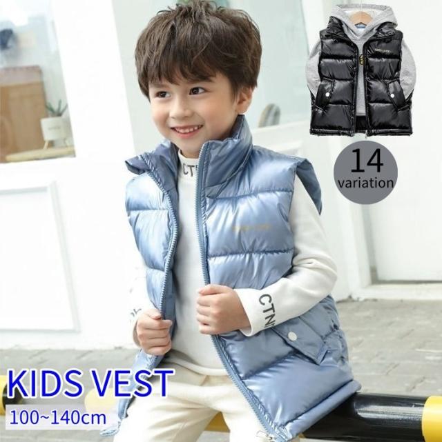 ベスト キッズ ジュニア 子供用 男の子 女の子 アウター ダウン風 前開き メタリック あったか 暖かい 防寒 ポケット付き