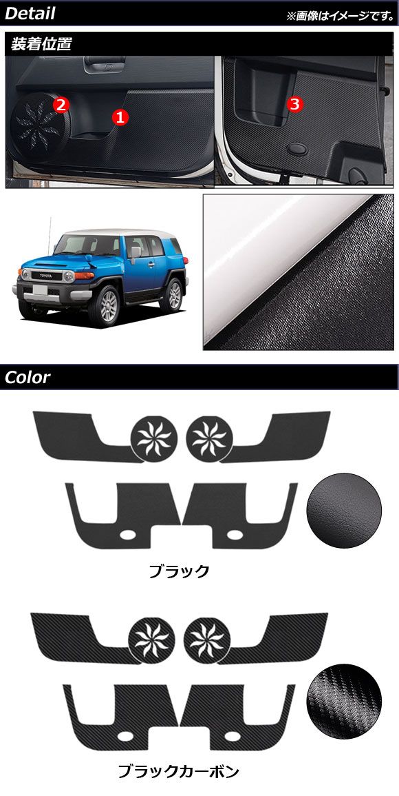 ドアアンダーステッカー トヨタ FJクルーザー GSJ15W 2010年12月〜2018年01月 ブラックカーボン 合皮 入数:1セット(6個) AP-IT2127-BKC ドアキックガード ドアキックマット ドアキックシート キックガード キックガードマット キックガードシート ドアアンダーガード ドアアンダーマット ドアアンダーシート ドアキック ドアステッカー ドア サイドドア サイド キック インナードア ドアポケット アンダー 足元 ガーニッシュ リム トリム ベゼル インナー 車内 内側 保護 プロテクト プロテクター プロテクタ シート カバー ガード ステッカー シール デカール フィルム 革 皮 レザー 内装 インテリア 傷防止 傷 キズ 汚れ防止 汚れ 防汚 泥 泥汚れ ブラック カーボン 合成皮革 フェイクレザー FJ CRUISER エフジェイクルーザー エフジェークルーザー GSJ GSJ15 GSJ15系 GSJ15型 15 15系 15型 TOYOTA トヨタ自動車 ドア サイドドア サイド キック インナードア ドアポケット アンダー 足元 ガーニッシュ リム トリム ベゼル インナー 車内 内側 保護 プロテクト プロテクター プロテクタ シート カバー ガード ステッカー シール デカール フィルム 革 皮 レザー 内装 インテリア 傷防止 傷 キズ