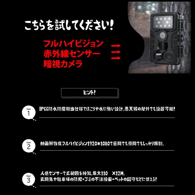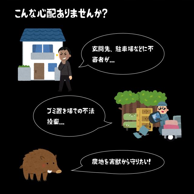 ★玄関先、駐車場などの防犯・ゴミ置き場での不法投棄の防止・農地を害獣から守るなど、いろんな場面で役立つ!