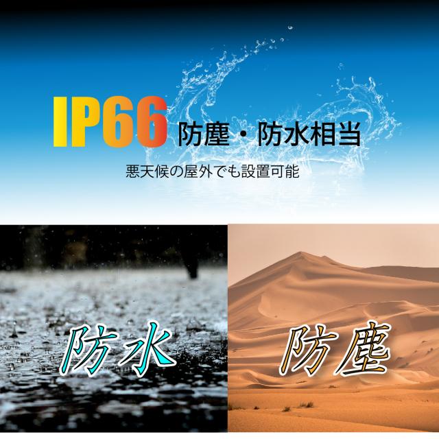 ★IP66防水防塵相当仕様でほこりや水に強い設計。悪天候の屋外でも設置可能。