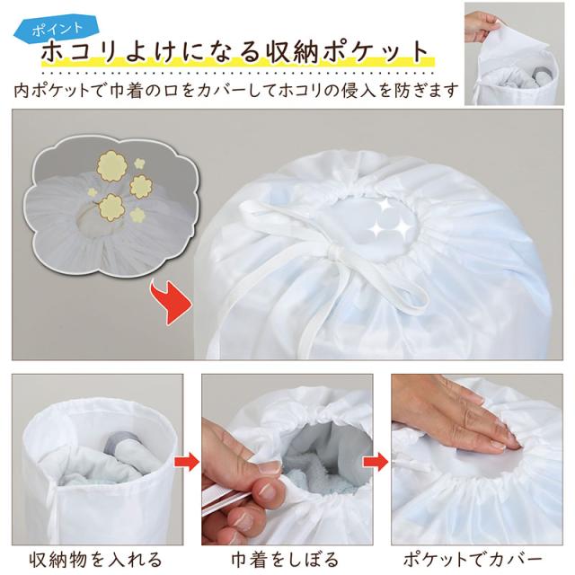 ●内ポケットで巾着の口をカバーすることで、ホコリが入るのを防ぐ。
