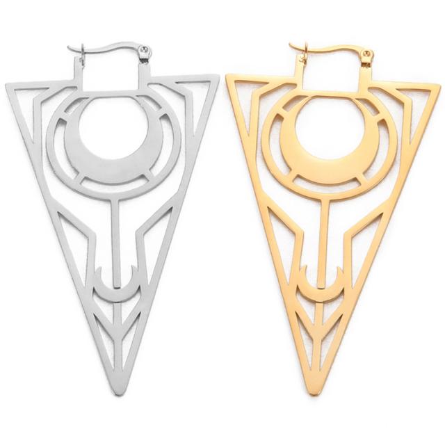 三角形のトライアングル型のフレームに三日月や古代のエジプトの象形文字のようなデザインのお洒落なステンレスピアス。