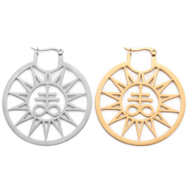 丸いラウンド型のフレームに透かしで太陽と永遠を意味する無限のマークをデザインしたお洒落なステンレスピアス。