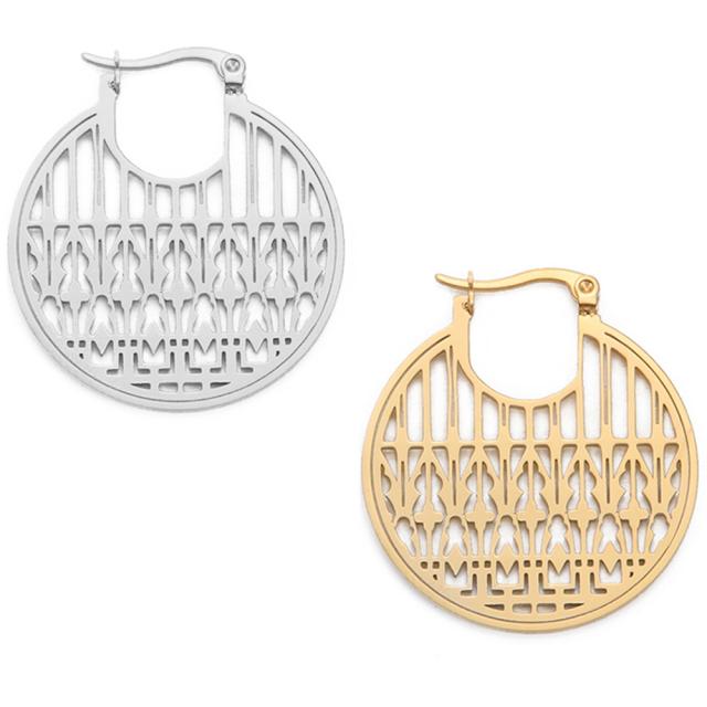 丸いラウンド型のフレームに透かしで和風の行燈や提灯のような綺麗な格子をデザインしたお洒落なステンレスピアス。