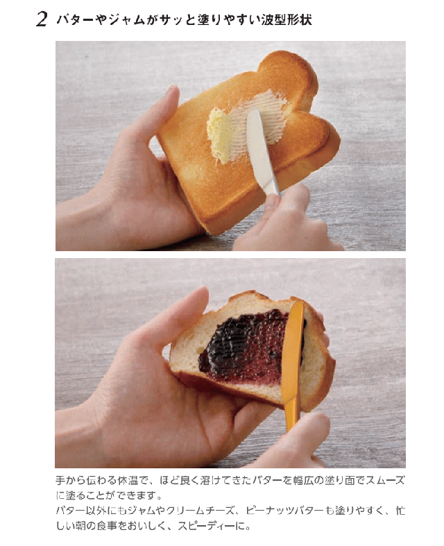 ・手の熱でバターが早く溶けて塗りやすい。バター以外にもジャムやクリームチーズ、ピーナッツバターも塗りやすく、朝の忙しい時間でも素早く塗れて便利です