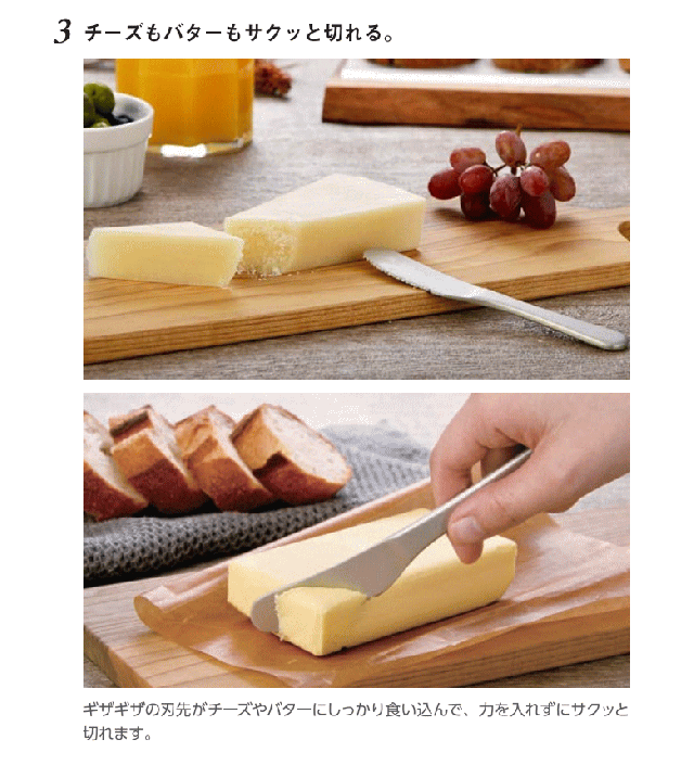 ・ギザギザ(波型形状)の刃先がチーズやバターをしっかり食い込んで、力を入れずにサクッと切れます