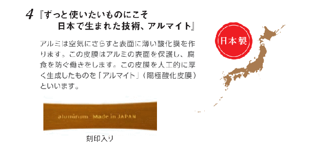 ・アルミは空気にさらすと表面に薄い酸化膜を作ります。この皮膜はアルミの表面を保護し、腐食を防ぐ働きをします。この皮膜を人工的に厚く生成したものを「アルマイト」(陽極酸化皮膜)といいます