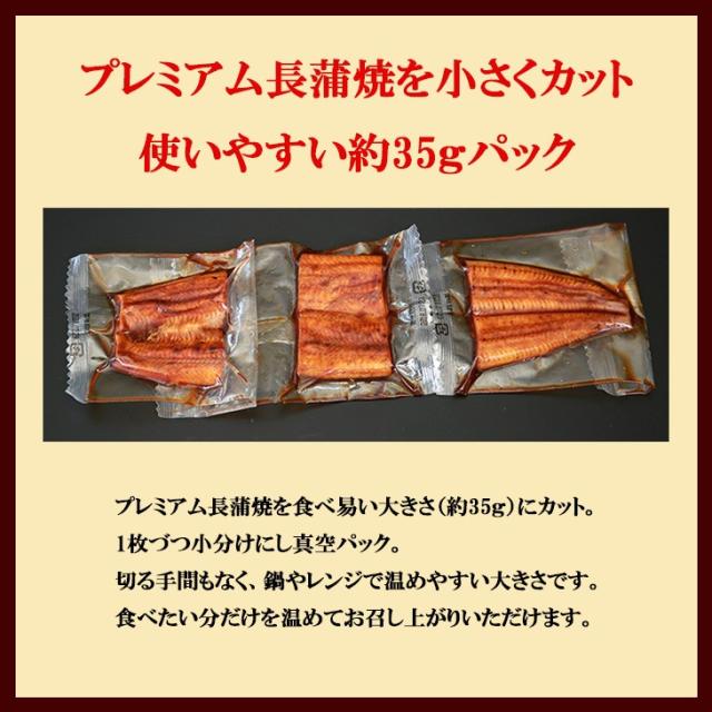 プレミアム長蒲焼を食べ易い大きさ(35〜40g)にカットし、1枚づつ小分けに真空パックしました。