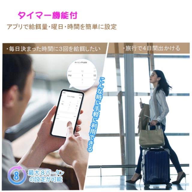 ・仕事での残業で遅くなる日や短期出張、旅行、朝寝坊、急な外出でもペットの食事を心配することなく安心。