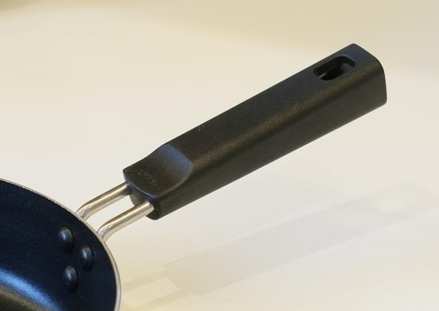ハンドルは熱くなりにくいフェノール樹脂素材を使用しています。手に自然とフィットするスクエア形状で、しっかり握れて調理しやすい仕様です。また引っ掛け穴が付いているので、場所を取らずに掛けて収納できます。