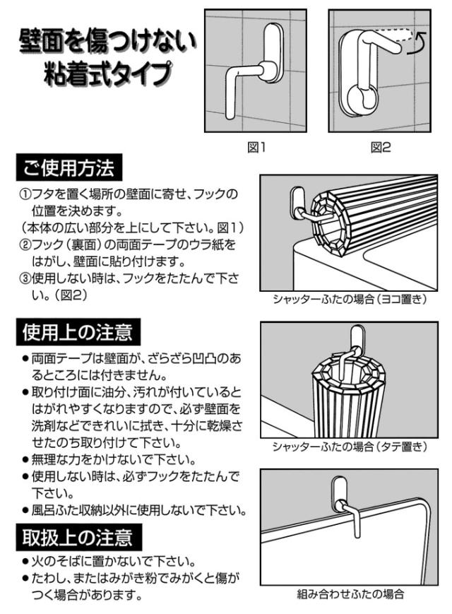 両面テープは壁面がザラザラ凹凸のあるところには付きません。 取り付け面に油分、汚れがついているとはがれやすくなりますので、必ず壁面を洗剤等できれいに拭き、十分に乾燥させたのち取り付けてください。 無理な力を掛けないでください。 使用しない時は、必ずフックをたたんでください。 風呂ふた収納以外に使用しないでください。 |