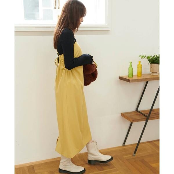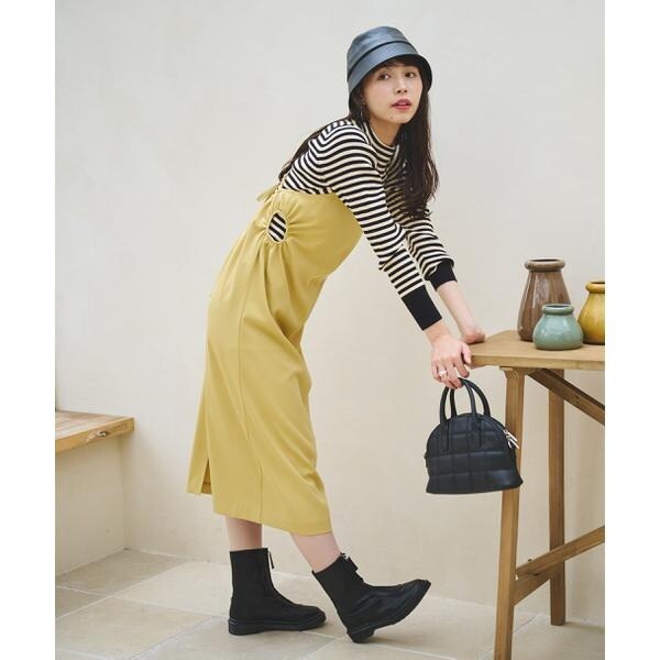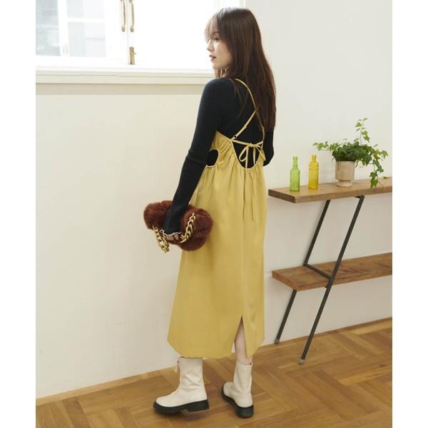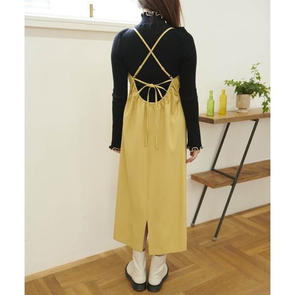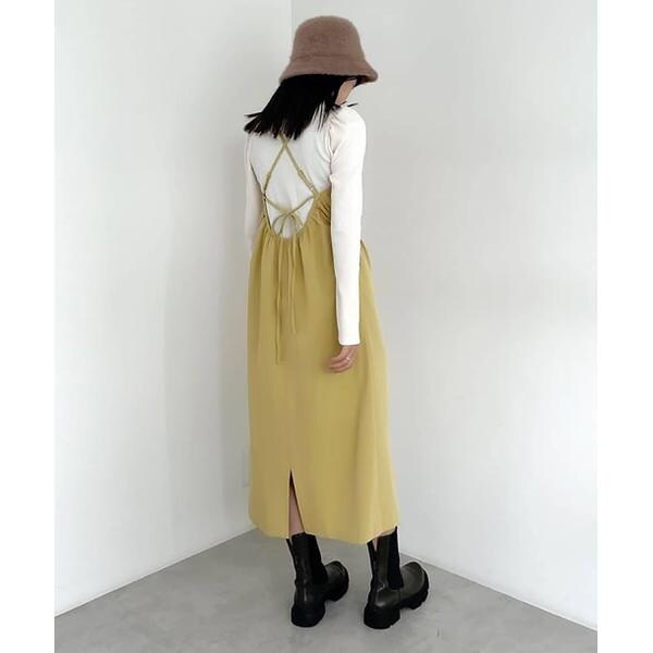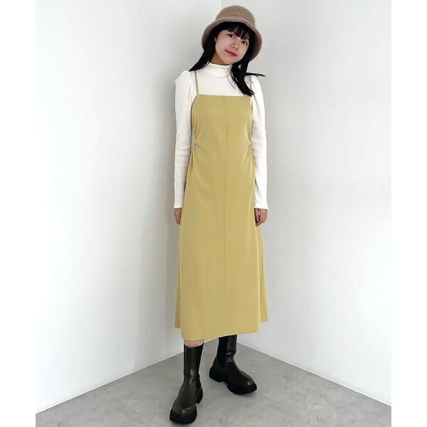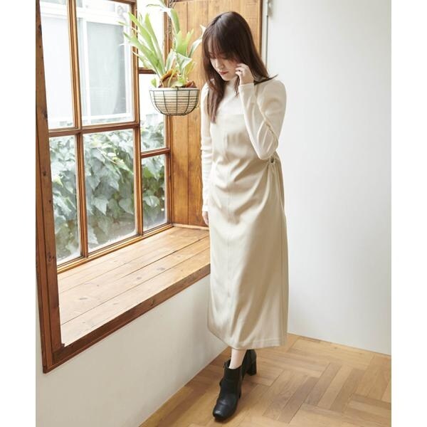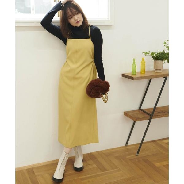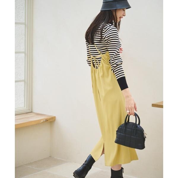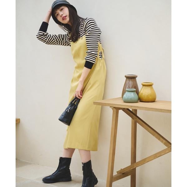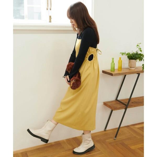 今季注目トレンドのディテールを取り入れたジャンパースカート。すっきりとしたIラインのシルエットに、抜け感のあるサイドホールがポイント。インにハイネックトップスを着るのがおススメです。バックスタイルはクロスしたショルダー紐やリボンで長さやフィットの調節可能。センタースリットが入っているので足さばき良好です。ブーツを履くとバランス良く決まります。