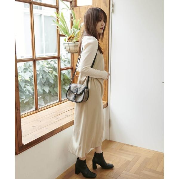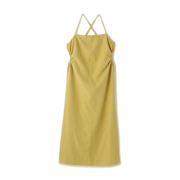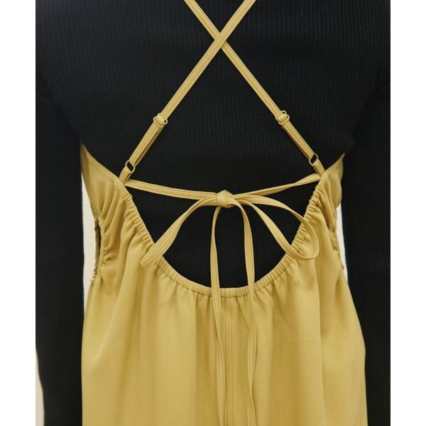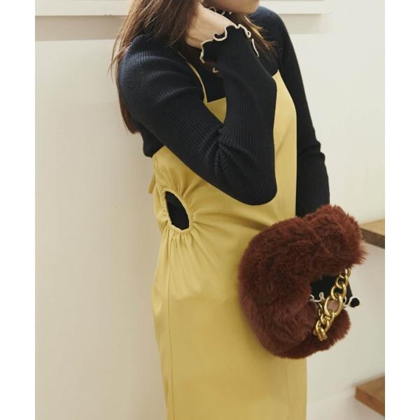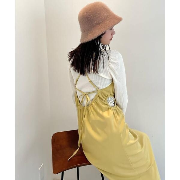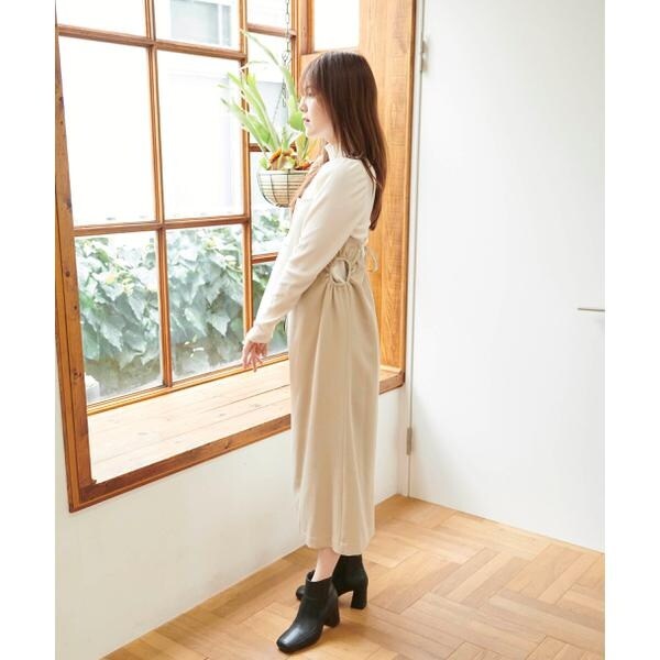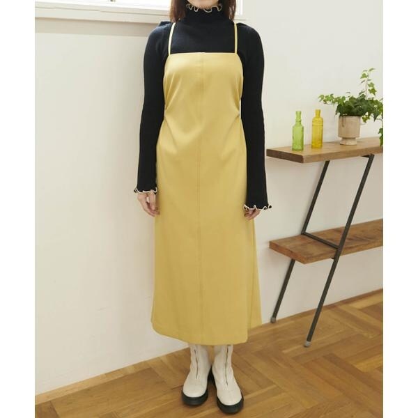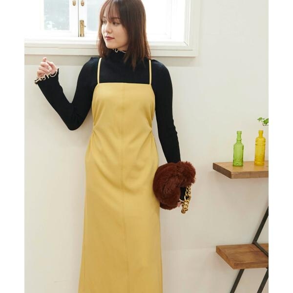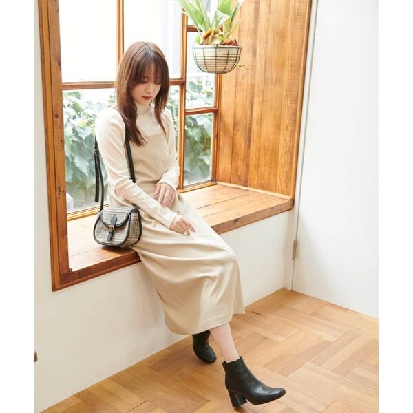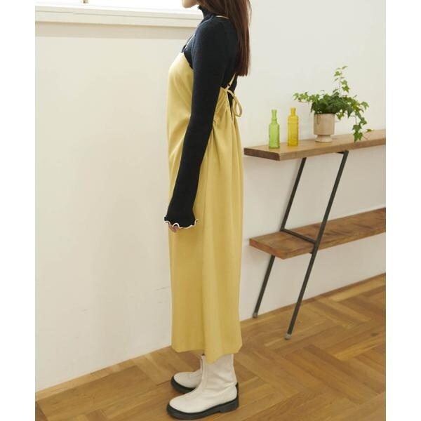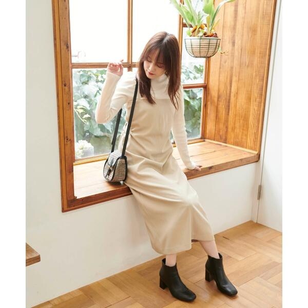 今季注目トレンドのディテールを取り入れたジャンパースカート。すっきりとしたIラインのシルエットに、抜け感のあるサイドホールがポイント。インにハイネックトップスを着るのがおススメです。バックスタイルはクロスしたショルダー紐やリボンで長さやフィットの調節可能。センタースリットが入っているので足さばき良好です。ブーツを履くとバランス良く決まります。