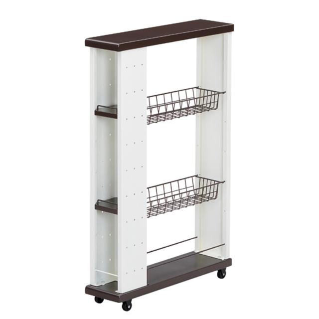 2段のバスケットは高さ調節が可能です。10cmピッチで変えられるので、収納する物に合わせて取りやすい高さに設定することができます。調味料や小瓶など細々した物もしっかりと収納できて便利です。