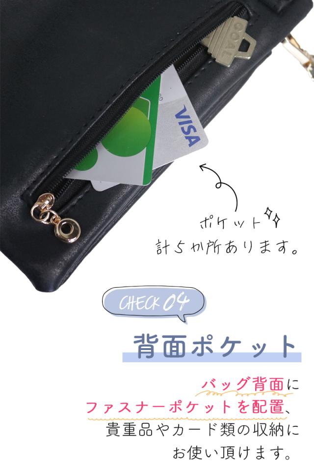 バッグ背面にファスナーポケットを配置、貴重品やカード類の収納にお使い頂けます。