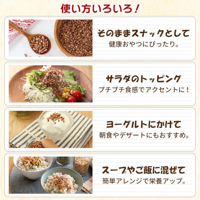 1日に大さじ3杯(約12g)を目安にお召し上がりください。 炊かずにそのままお召し上がりいただけます。 サラダやシリアル、ヨーグルトのトッピングとして、 ご飯やお料理、お菓子に混ぜるなど、幅広くお使いいただけます。 |
