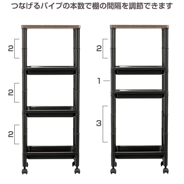 棚の高さをアレンジできる棚の間のパイプ本数で、棚の高さを約10cm単位で調整できます。間隔を広くしたり狭くしたり、用途に合わせてアレンジ。