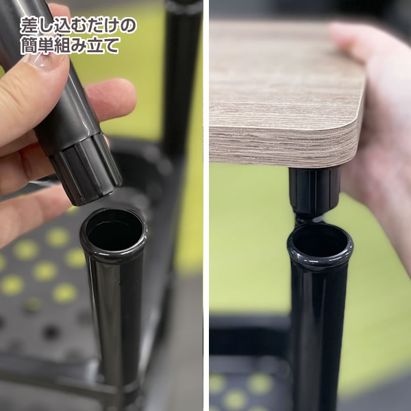 組立カンタンバスケットとキャスター、テーブルをそれぞれ差し込むだけ。工具いらずの簡単組み立て。