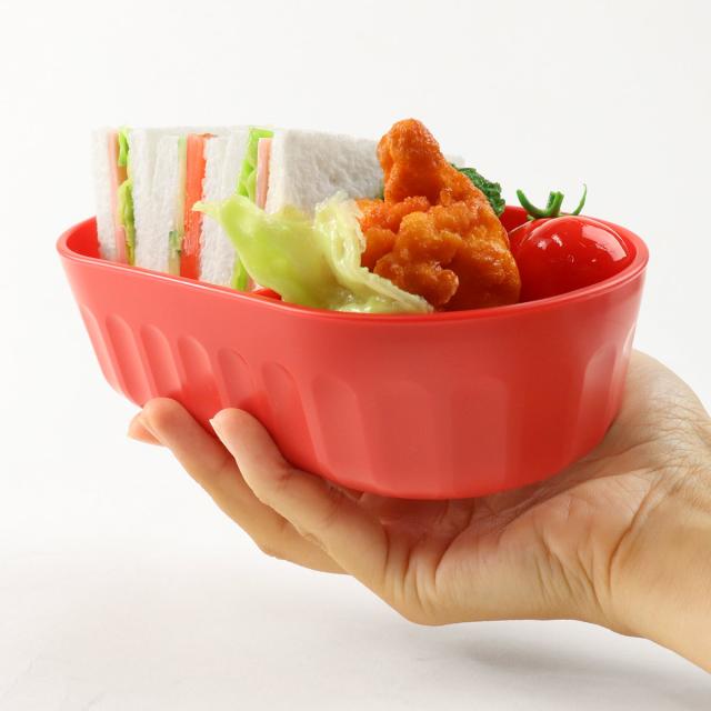 お弁当本体の側面はポコポコしているのでお弁当を持ちながら食べる時に、指にフィットして持ちやすいです。また、グラタン皿のようなデザインでかわいいのも嬉しいポイントです。