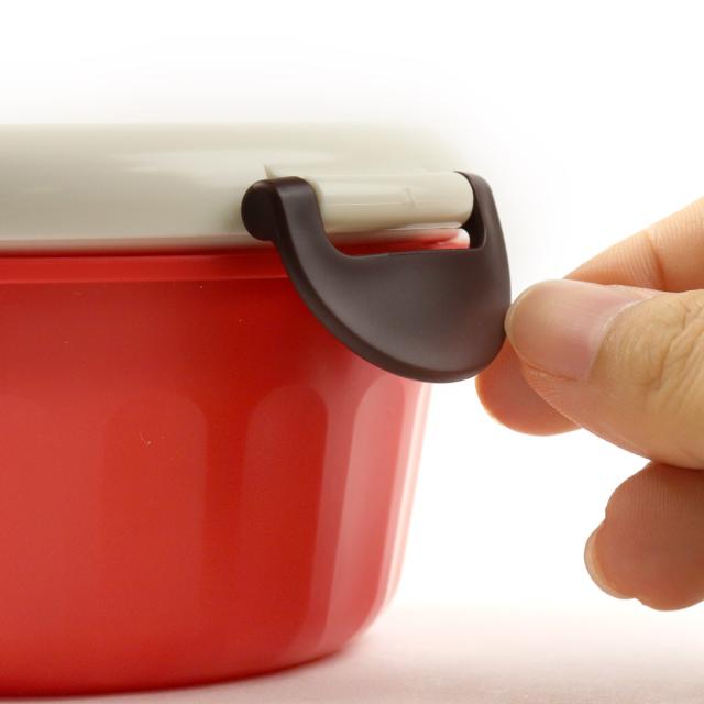 蓋裏のパッキンと2点ロックでしっかり固定できるので、汁漏れしにくく、持ち運ぶ時も安心です。閉める時もカチッと音がするので閉め忘れがありません。