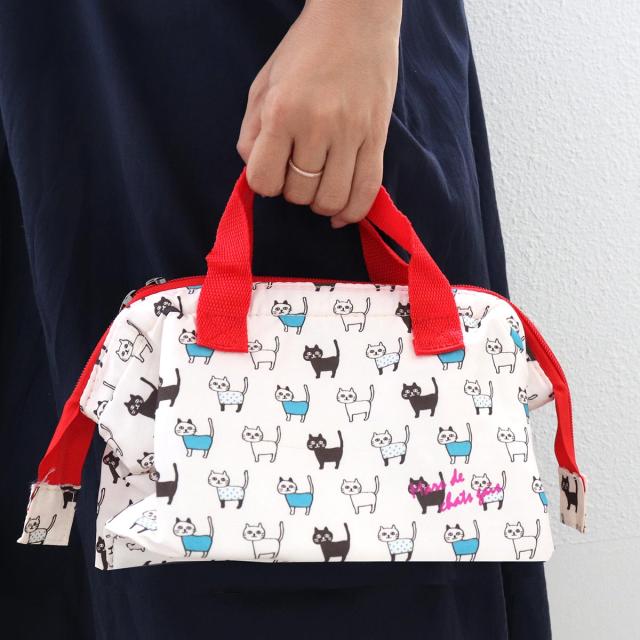 全面に猫が描かれた可愛いランチバッグです。ファスナーは開閉しやすいダブルファスナーを使用しています。バッグの取り出し口はがま口型になっており、大きく開くため、物の出し入れがスムーズに行えます。トートタイプなので持ち運びしやすく、毎日の通学や通勤に便利です。ちょっとしたお買い物の際に使うエコバッグとしてもお使いいただけます。