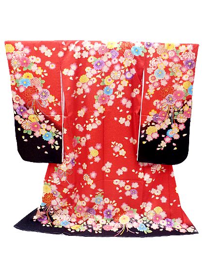 七五三 女の子着物単品 四つ身 絵羽柄 襦袢付き ポリエステル 7才 7歳 七歳 七才 赤地 花輪 牡丹 桜 柄 No.2203