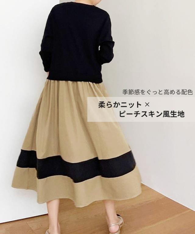 柔らかニット×ピーチスキン風生地のドッキングデザイン