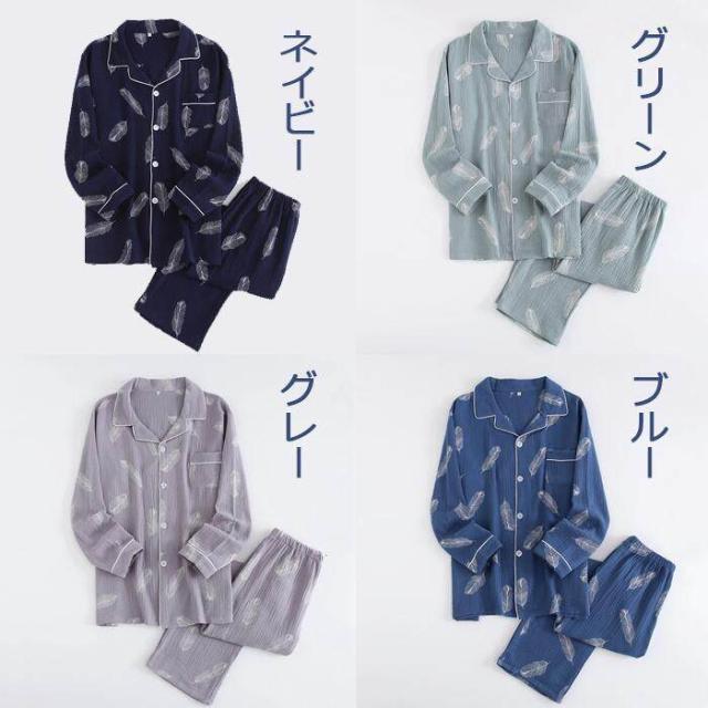 ルームウェア メンズ ダブルガーゼ パジャマ 綿100% 男性 前開き 上下セット ナイトウェア 長袖&長ズボン ポケット付き 部屋着 敏感肌 通気性 蒸れにくい 優れた耐久性 誕生日 父の日 敬老の日 プレゼント