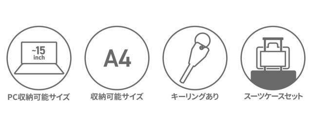 | 仕様 | <外側> PC収納×1 └ 内蔵 タブレット収納×1 ジップポケット(M)×1 └ 内蔵 ポケット(S)×1 カードポケット×2 ペンホルダー×1 キーフック×1 ジップポケット(M)×1 マグネットポケット(S)×1 <内側> ジップポケット(L)×1 ポケット(S)×2 <付属品> ネームタグ×1 |