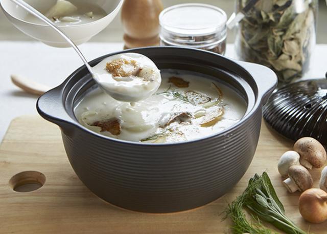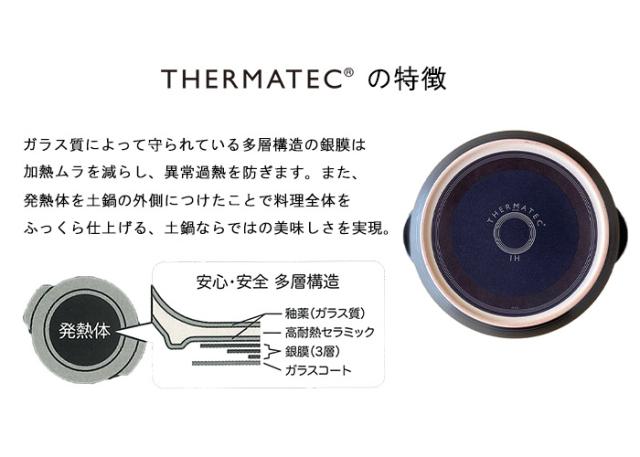 高耐熱素材でできた低吸収率を誇る、さまざまな熱源に対応したハイスペック土鍋 THERMATEC?。 土鍋本来の蓄熱性により、食材をじんわり温め、うまみをギュッと引き出します。 深型の形状は、じっくりコトコト煮込む毎日の調理に大活躍です。 もちろん2人用の鍋料理にもお使いいただけます。