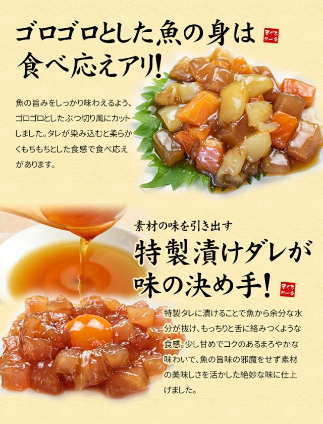 | 原材料 | 【海鮮漬け】黄肌鮪(日本、台湾、その他)、イカ(日本)、トラウトサーモン(チリ)、たれ(醤油、米発酵調味料、砂糖、魚介エキス、魚油、醸造酢、昆布エキス、酵母エキス)/増粘剤(加工デンプン)、(原材料の一部に小麦・大豆を含む) 【まぐろづけ】袖長鮪(台湾)、醤油、米発酵調味料、砂糖、魚介エキス、魚醤、醸造酢、昆布エキス、酵母エキス/増粘剤(加工デンプン)、(原材料の一部に小麦・大豆を含む) |