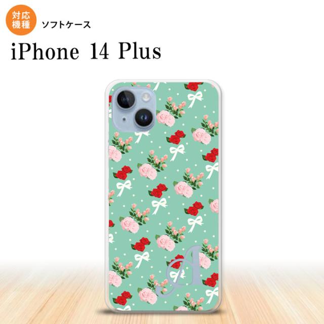 I14PL iPhone14 plus スマホケース 背面ケースソフトケース 花柄 バラ リボン ターコイズ +アルファベット