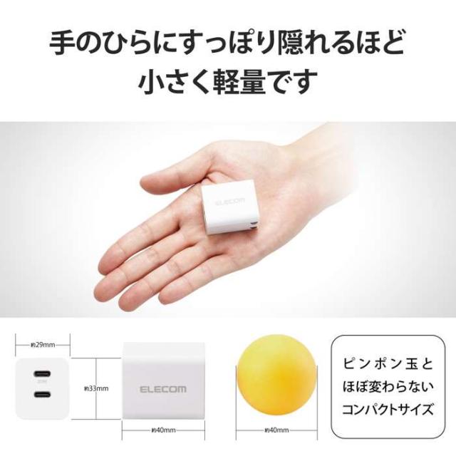 ■USB Type-C(TM)(USB-C(TM))ポートを2ポートを搭載し対応するスマートフォン、タブレットなどを超高速充電できるUSB AC充電器です。 ■手のひらにすっぽり隠れるほど小さく軽量なので、出張などの外出時の持ち運びに便利です。 ■USB Power Delivery(パワーデリバリー)とは、アダプターと接続機器間で情報をやり取りすることで、その機器間における最適な電力を選択し、高速充電を実現するUSB規格です。 ■※本製品の最大出力は20Wです。 ■本製品はUSB-IFのテストと同等のテストを弊社独自で実施し、高い安全性が保たれており、USB Power Delivery対応製品にご使用いただけます。 ■端末に応じて出力が5V/3A、9V/2.22Aと可変し、スマートフォンやタブレットなどのさまざまな機種で高速充電ができます。 ■※USB Power Delivery 20W充電に対応した機種に限ります。 ■スマートフォン等に付属もしくは対応する充電用USBケーブルを使用して充電可能です。 ■※本製品にケーブルは同梱しておりません。別途MFi認証品のUSB Type-C(TM)(USB-C(TM)) to LightningケーブルやエレコムのUSB規格認証USB Type-C(TM)(USB-C(TM)) to USB Type-C(TM)(USB-C(TM))ケーブル等をご用意ください。 ■出力端子が2ポートありますので、スマートフォンなどを2台同時に充電が可能です。 ■※2ポート同時出力時は合計最大15Wとなります。(USB Power Deliveryでの出力はできません) ■未使用時は電源プラグを折りたたんで充電器本体に収納できるので持ち運びにも便利です。 ■耐トラッキング性の要求事項(PSE:電気用品安全法)を満たしたコンセントプラグを採用しています。 ■※端末本体や充電器が濡れた状態で充電すると、異常な発熱・焼損の原因となり大変危険ですのでおやめください。 ■※USB Type-C(TM) and USB-C are trademarks of USB Implementers Forum ■自社環境認定基準を1つ以上満たし、『THINK ECOLOGY』マークを表示した製品です。 ■廃棄物削減に取り組み、製品に同梱する取扱説明書等をペーパーレス化した製品です。 ■環境保全に取り組み、製品の包装容器におけるプラスチック重量を、社内基準製品より20%以上削減した製品です。 ■廃棄物削減に取り組み、製品に同梱する取扱説明書等をペーパーレス化した製品です。 ■環境保全に取り組み、製品の包装容器におけるプラスチック重量を、社内基準製品より20%以上削減した製品です。