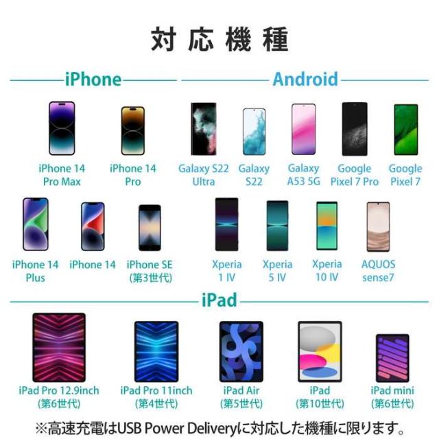 ■対応機種:USB Type-C(TM)(USB-C(TM))ポートからUSB Power Delivery 3.0(20W)の規格内で充電が可能な機器。