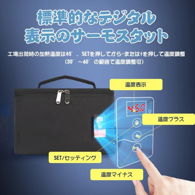 「保温保冷」内側にアルミ箔素材を採用し、保温保冷効果抜群です 「USB加熱式」便利なUSB充電式を採用、パソコン、車載USB充電器、モバイルバッテリーなどで使用できます 「温度調整可能」工場出荷時の加熱温度は45°、SETを押してから-または+を押して温度調整 「防水」外側はオックスフォード生地で、優れた撥水性を持っています