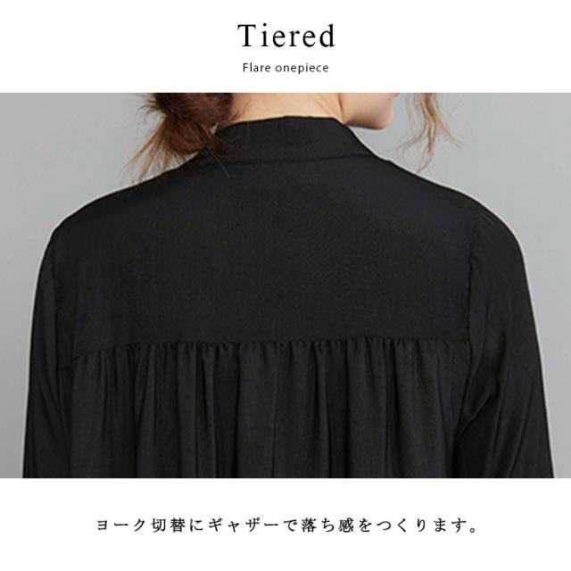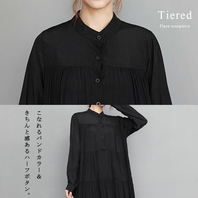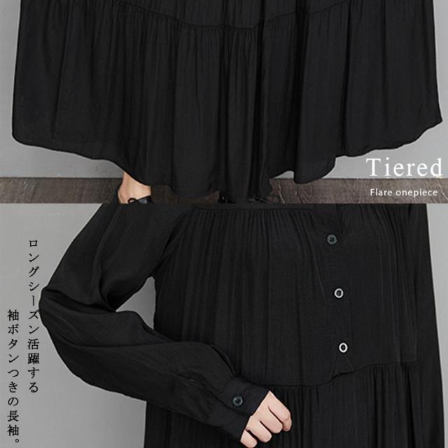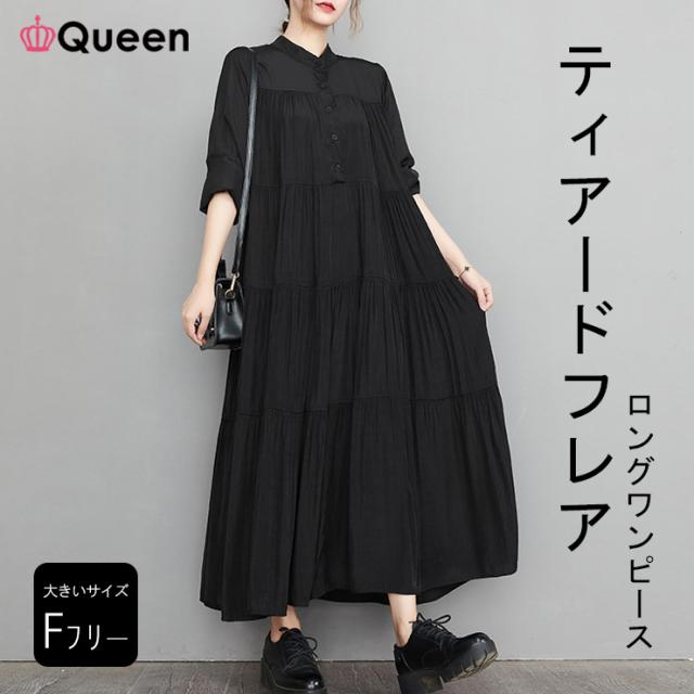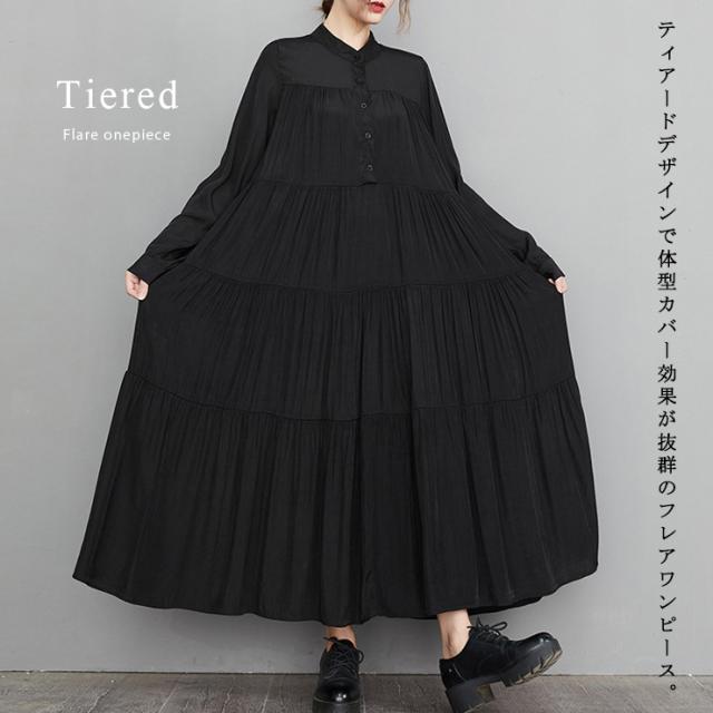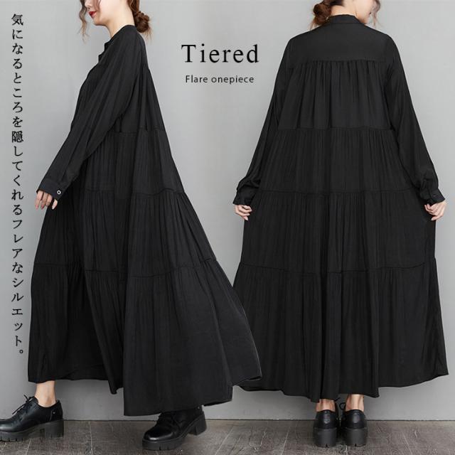 大きいサイズ レディース ティアードワンピース オーバーサイズ シャツワンピ 長袖 黒 春 秋 (116370)