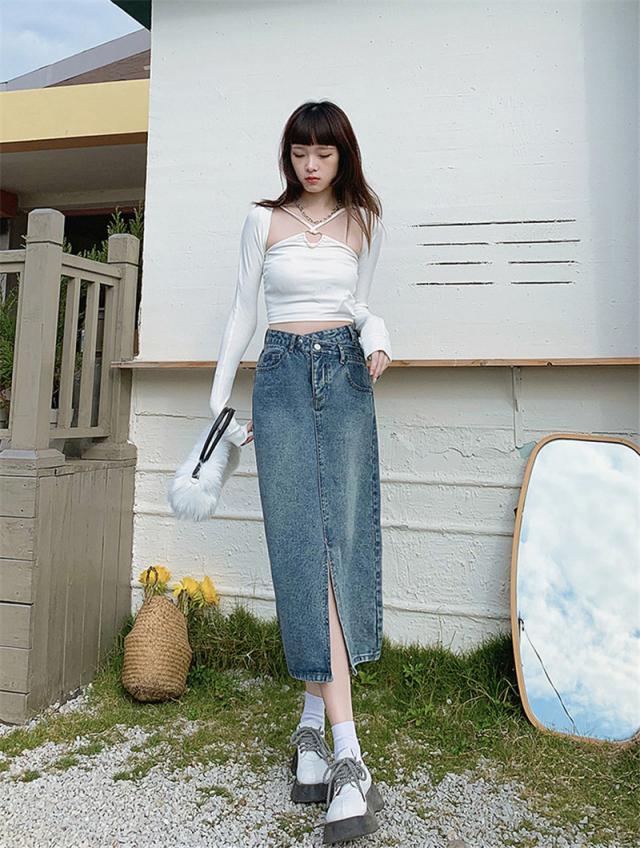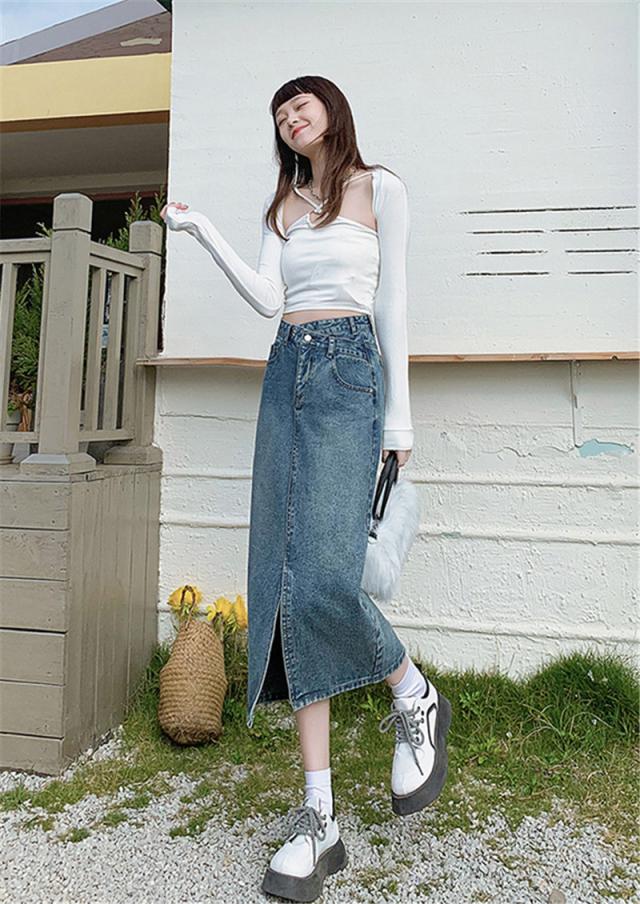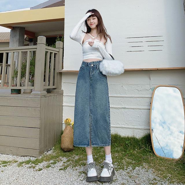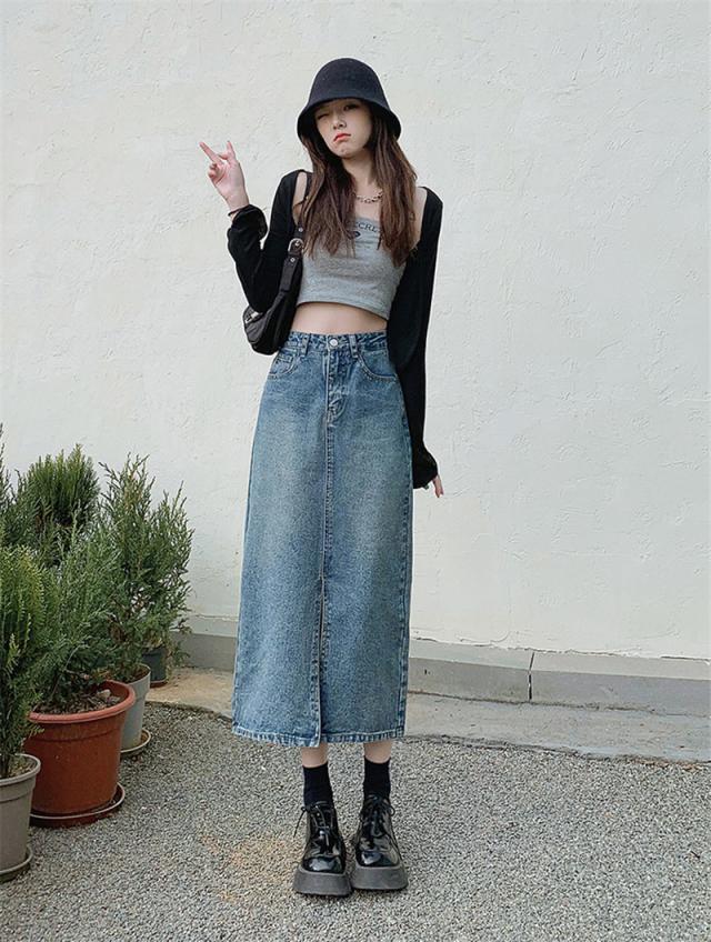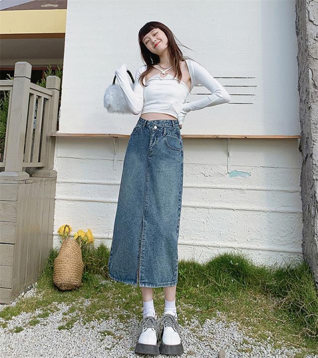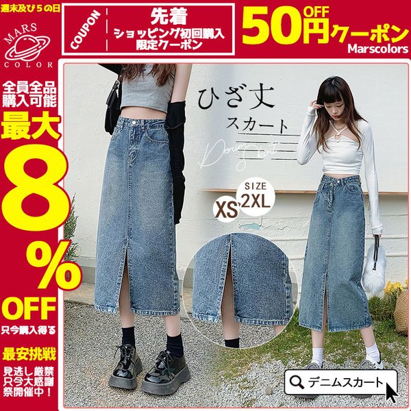 デニムスカート ひざ丈スカート コーデ オールシーズ ナチュラル 膝丈 スリット ボトムス ロング ジーンズ 美しい 着痩せ 体型カバー カジュアル