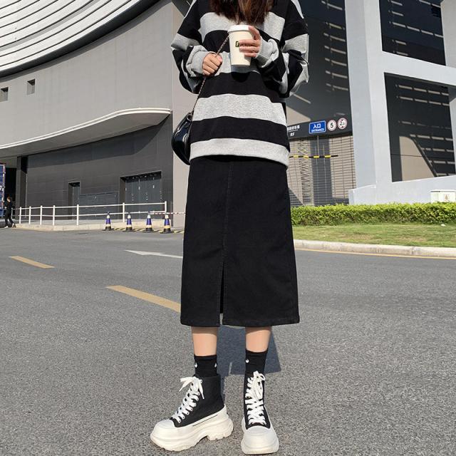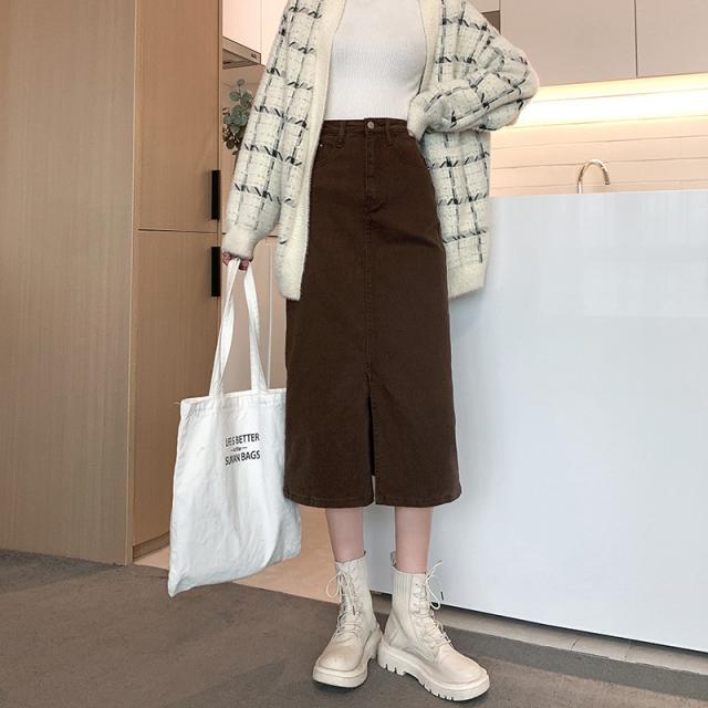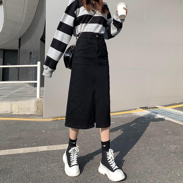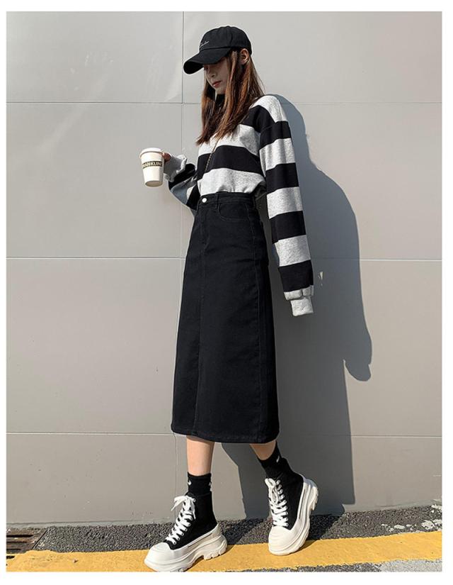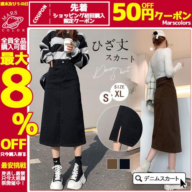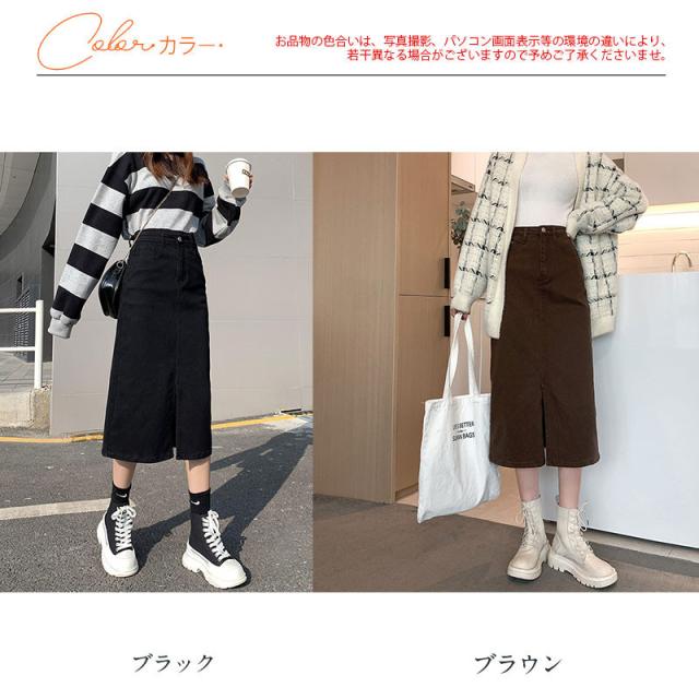 デニムスカート ひざ丈スカート コーデ トレンドライク ストレッチ ボトムス ロング 膝丈 ジーンズ スリット 着痩せ 着回し 体型カバー