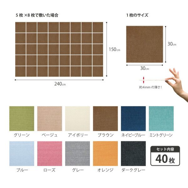 タイルカーペット ジョイントマット マット 洗える はっ水 置くだけ 吸着 ズレない 床暖房 ペット用撥水タイルマット 同色40枚入 日本製 30×30cm/厚み4mm 滑らない 子供 ペット 負担軽減 おくだけ吸着 サンコー