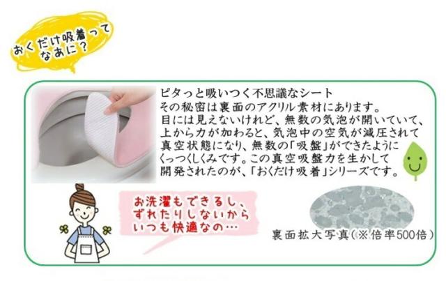 ![]() | おくだけで吸着!ズレない、動かない。 取り替えカンタン。 くりかえしお洗濯もでき、乾きも早い。 厚み9mmでお尻にやさしい〜。 |