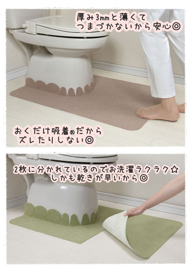 ![]() | 厚み3mmと薄くてつまずきにくい、おくだけで吸着するから ズレずに安心なバリアフリーなトイレマット ハサミでカットもでき、 くりかえし洗濯しても 吸着します。 便器まわりは切り込み付きで 便器と床の汚れを防ぎます。 |