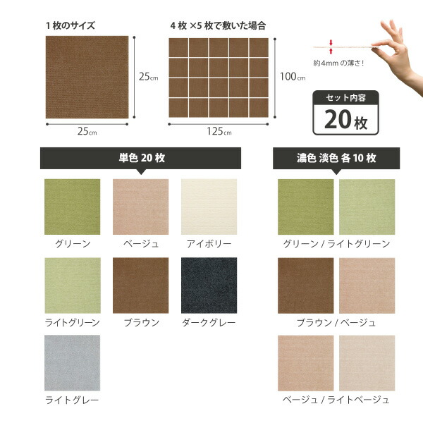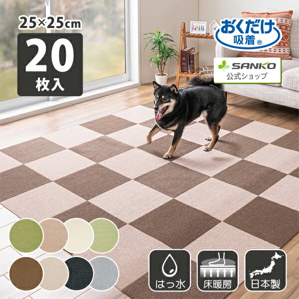 タイルカーペット ジョイントマット マット 洗える はっ水 置くだけ 吸着 ズレない 床暖房 おくだけタイルマット 25cm角 20枚入 日本製 25×25cm/厚み4mm 子供 ペット 滑らない 負担軽減 おくだけ吸着 サンコー
