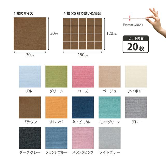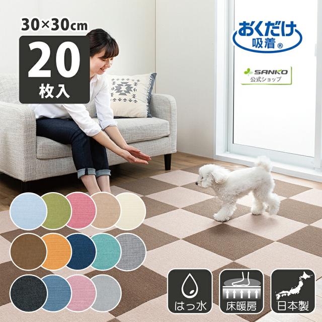 タイルカーペット ジョイントマット マット 洗える はっ水 置くだけ 吸着 ズレない 床暖房 ペット用撥水タイルマット 同色20枚入 日本製 30×30cm/厚み4mm 子供 ペット 滑らない 負担軽減 おくだけ吸着 サンコー