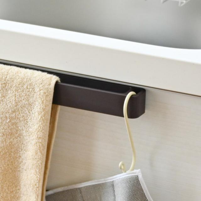 平らな壁面であれば場所を選ばずに設置することができるタオルハンガーです。キッチンだけでなく洗面所でもお使いいただけます。薄型のデザインなので、動線を塞がず作業の邪魔にもなりません。
