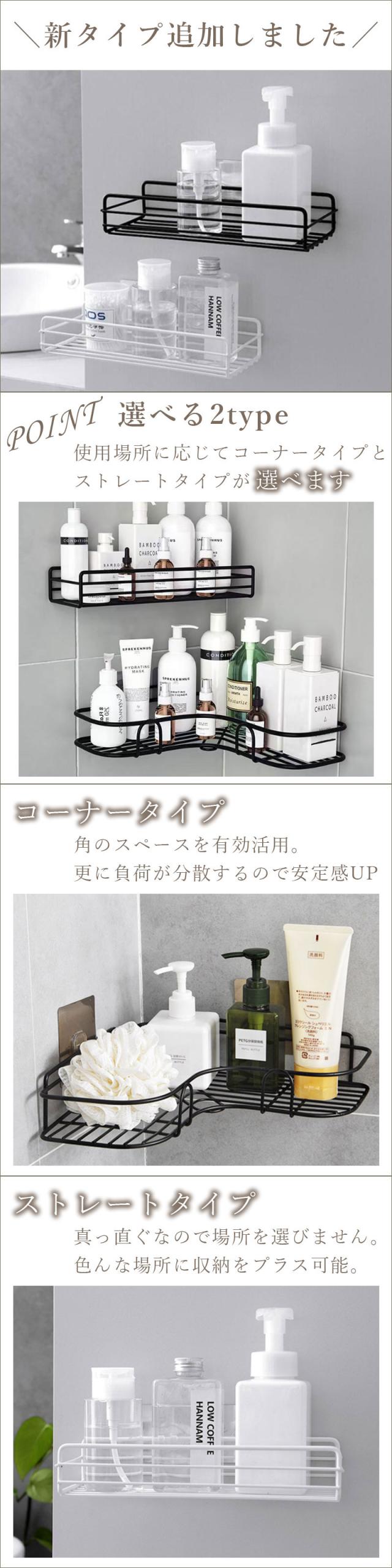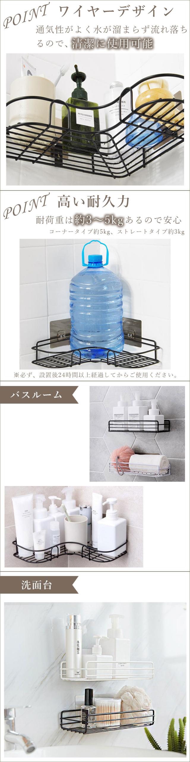 | 商品 特徴 | 【選べる2タイプ】 使用場所に応じてコーナータイプとストレートタイプをお選びいただけます。 【ワイヤーデザイン】 通気性がよく水が溜まらず流れ落ちるので、清潔に使用可能。 【高い耐久力】 耐荷重は約3〜5kgあるので安心です。 |