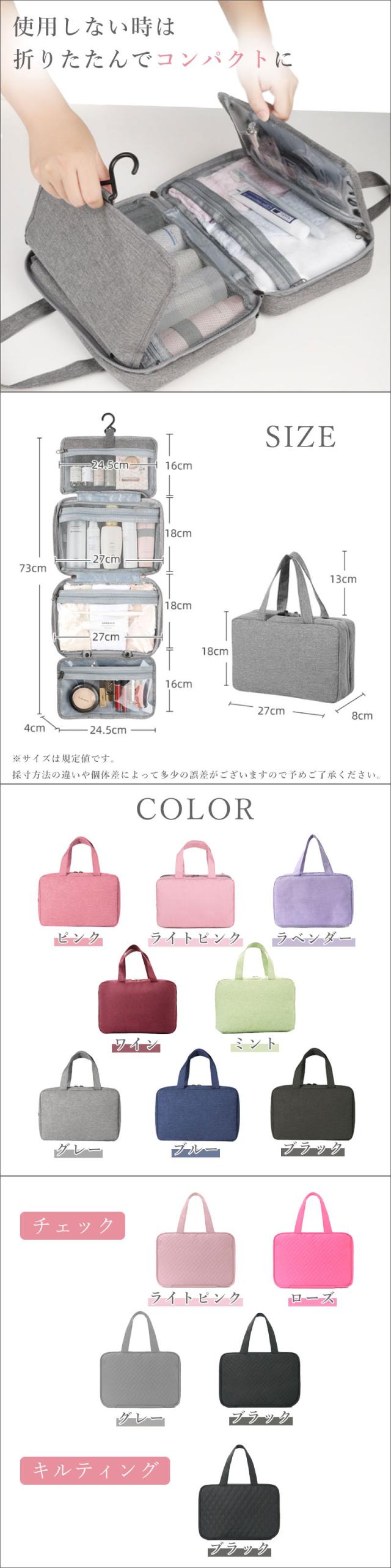 | 商品 特徴 | 【大容量】 たっぷり入る大容量サイズなので、荷物が多い方も一つあれば便利です。 【4つのポケット】 収納がポケットごとに分かれており、メッシュ素材とPVC素材があるので、乾湿を分けて整理整頓して収納いただけます。 一番下のポケットはボタンで取り外しも可能です。 【安心の撥水加工】 撥水機能付きなので、水回りでの使用時も安心です。 【便利機能搭載】 フック付きで吊り下げ可能なので、壁掛けでも使用可能。取っ手があるので、荷物が多く重くなってしまっても持ち運び便利です。 【豊富なカラー】 13色あるので、好みのデザインをお選びいただけます。 |