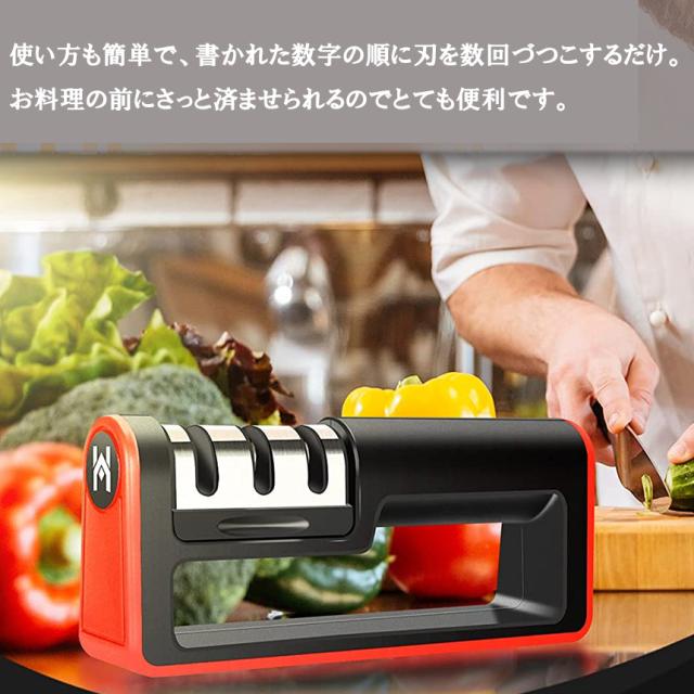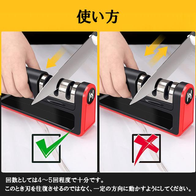 粗研ぎ、細研ぎ、仕上げ研磨3つの研ぎ方法がありまして、さまざまな状態のナイフに便利に使えます。軽く力を入れている程度なので、女性の方にも簡単に扱うことができます。