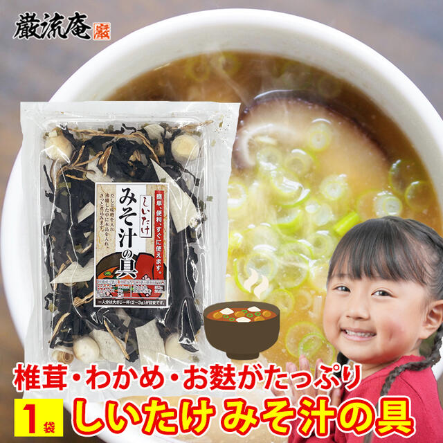 お味噌汁にスプーン一杯入れるだけで、簡単具沢山みそ汁に。しいたけ、わかめ、麩、ねぎなどの乾燥具材。